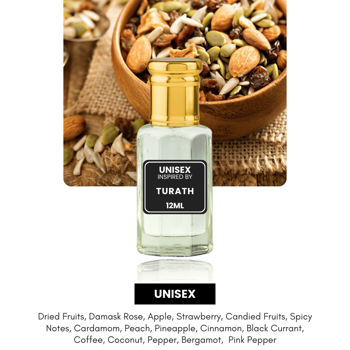 Exquisite Top Notes: Turath opens with an extravagant array of top notes, including Dried Fruits, Damask Rose, Apple, Strawberry, Candied Fruits, Spicy Notes, Cardamom, Peach, Pineapple, Cinnamon, Black Currant, Coffee, Coconut, Pepper, Bergamot, Cumin, Sweet Orange, and Pink Pepper. This dazzling combination sets the stage for a captivating journey into sensory bliss.
