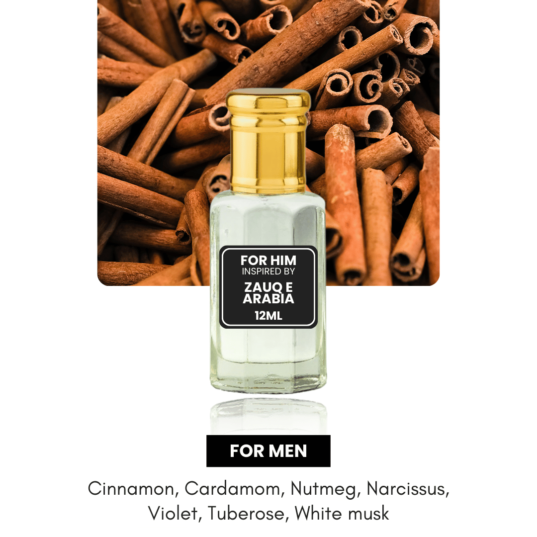 Binding these contrasting scents are the warm embrace of Arabic spices - Cinnamon, Cardamom, Nutmeg - and rare absolutes like Narcissus, Violet, and Tuberose.
